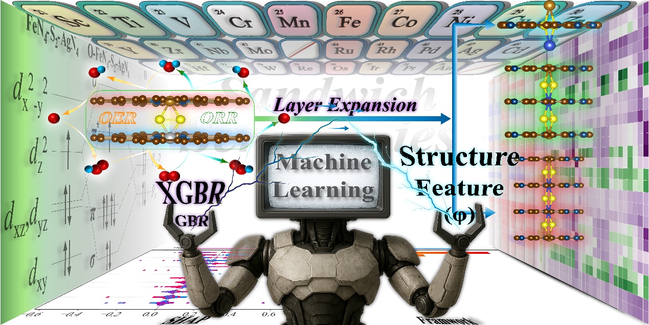 研究发现,在双层同核结构中存在6种高活性过渡金属位点,并据此构建了156种异核双层构型。其中,双功能催化剂FeN4-S2-AgN4和IrN4-S2-WN4分别表现出最优的OER性能和最优的ORR性能。轨道分析表明,过渡金属原子与硫桥的协同作用通过调节成键与反键电子分布,有效优化了氧中间体的吸附自由能。基于此,研究提出了一个修正的键级描述符,深入揭示了双层结构的活性机制。恒电位模拟证实双电层对反应能垒具有关键调节作用,深化了对层间耦合与桥接配体协同机制的理解,并由此提出了pH依赖的催化优化路径。最后,通过引入简化结构描述符(φ),增强了机器学习模型的泛化能力,成功将预测拓展至赝双层、三层及四层体系,为设计高效电催化剂提供了新的理论框架与见解。
