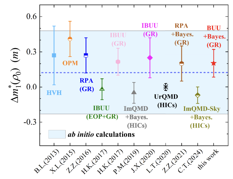 本研究基于拓展的 LBUU 输运模型,选取了一系列具有代表性的 Skyrme 有效相互作用势,系统性地探究了饱和密度下“同位旋矢量单核子有效质量”及“核物质介质中核子–核子散射截面”对重核208Pb的同位旋矢量巨偶极共振观测量的影响。本研究创新性地引入了贝叶斯分析方法,揭示了巨偶极共振观测量与核物质相关性质之间的内在联系,从而提取出有效质量结果,并有效约束了饱和密度下中子–质子有效质量劈裂。在丰中子核物质中,中子–质子有效质量劈裂与核物质状态方程密切相关,在宇宙早期演化过程中的中子–质子比、中子星冷却、稀有同位素结构形成以及重离子碰撞的动力学演化等方面均发挥着重要作用。本研究通过原子核巨偶极共振观测量,有效地约束了中子–质子有效质量劈裂的性质,为理解核物质的微观结构和天体物理过程提供了新的理论支撑。