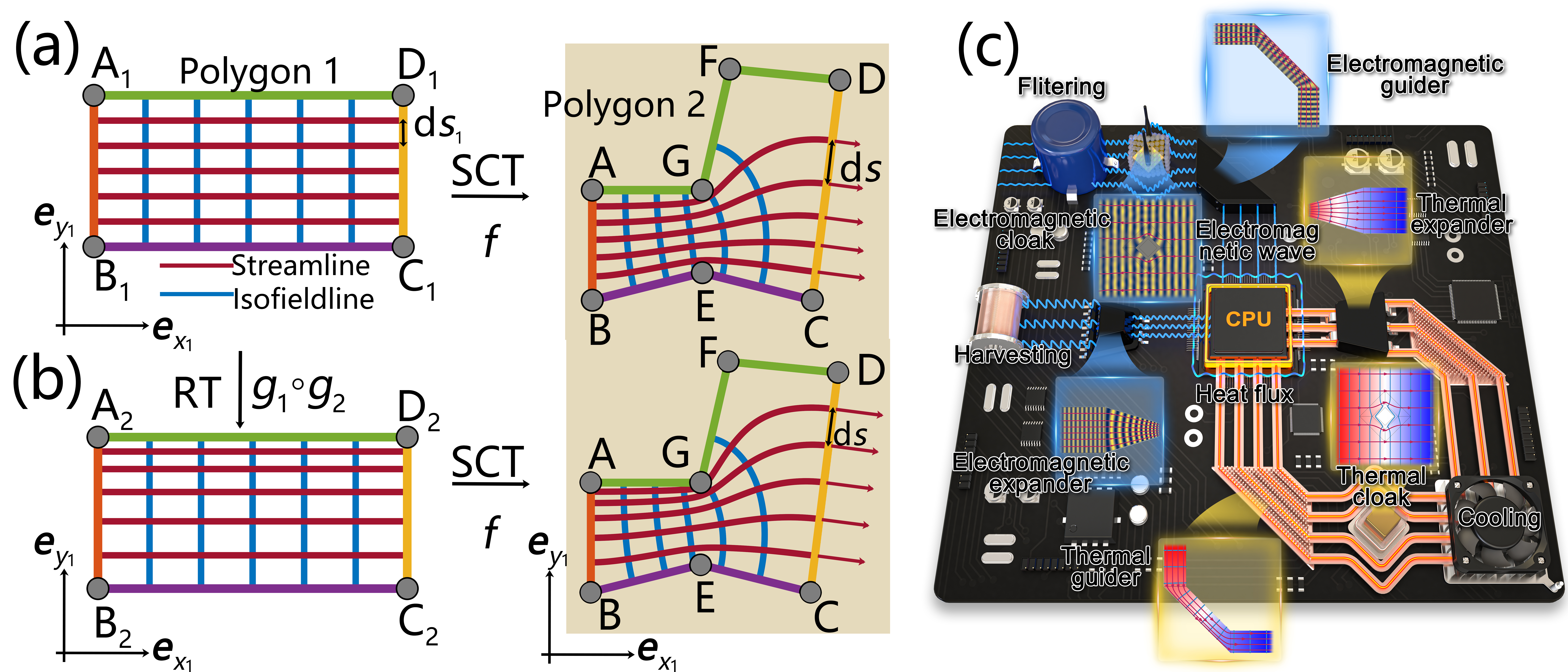 图1:(a-b)基于重标度Schwarz-Christoffel变换实现多物理场协同调控的原理与(c)潜在应用。