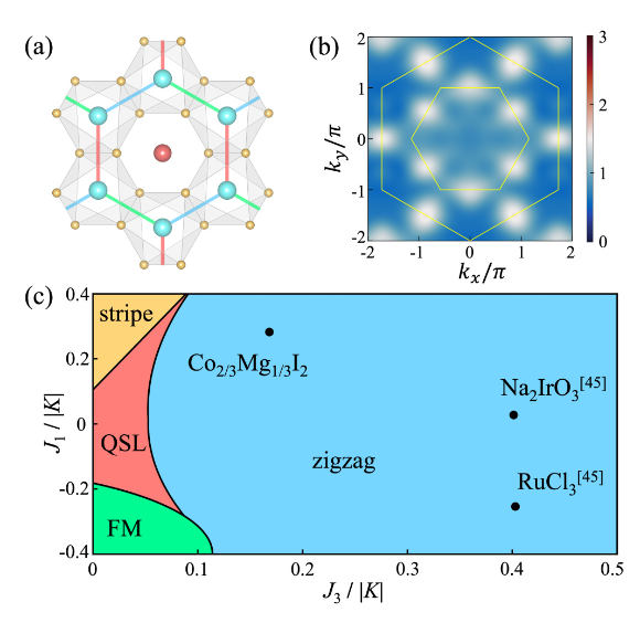 在本研究中,作者以二维范德华磁体 CoI2为研究对象,综合运用第一性原理计算和多体理论分析方法,揭示了其磁相互作用的微观起源。研究发现,CoI2中的磁性离子在强自旋-轨道耦合条件下形成各向同性的 Jeff=1/2 基态,体系具有显著的键依赖型 Kitaev 相互作用,但第三近邻磁交换引入的几何阻挫最终导致螺旋反铁磁有序。进一步研究表明,通过对 Co 位点进行 Mg 的部分取代,可有效削弱几何阻挫效应,使体系显著逼近 Kitaev 量子自旋液体相区。该成果为设计和调控量子自旋液体候选材料提供了新的理论思路,也为探索新型量子物态奠定了重要基础。
