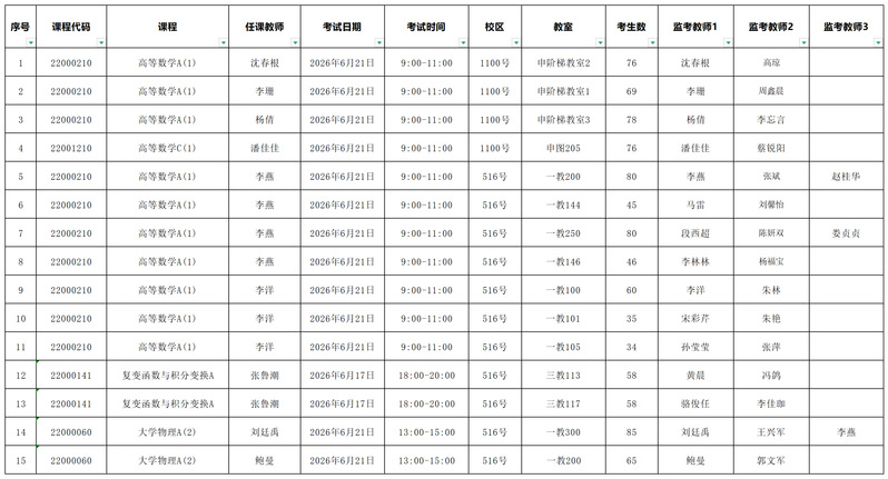 一、考试安排序号课程代码课程任课教师考试日期考试时间教室考生数监考教师1监考教师2监考教师3122000210高等数学A(1)沈春根2026年6月21日9:00-11:00申阶梯教室276沈春根高琼222000210高等数学A(1)李珊2026年6月21日9:00-11:00申阶梯教室169李珊周鑫晨322000210高等数学A(1)李燕2026年6月21日9:00-11:00一教20080李燕张斌赵桂华422000210高等数学A(1)李燕2026年6月21日9:00-11:00一教14445马雷刘馨怡522000210高等数学A(1)李燕2026年6月21日9:00-11:00一教25080段西超陈妍双娄贞贞622000210高等数学A(1)李燕2026年6月21日9:00-11:00一教14646李林林杨福宝722000210高等数学A(1)李洋2026年6月21日9:00-11:00一教10060李洋朱林822000210高等数学A(1)李洋2026年6月21日9:00-11:00一教10135宋彩芹朱艳922000210高等数学A(1)李洋2026年6月21日9:00-11:
