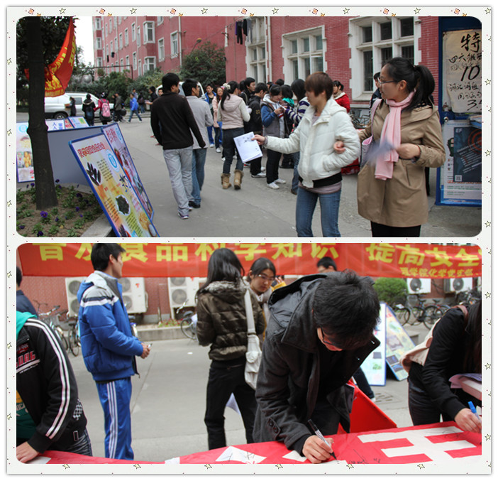 理学院本科生应用化学党支部食品安全知识普及活动历时7月之久,七次进社区,四次进公园,一次进课堂,一次进校园等,多次在人口密集的地方对食品安全进行宣传。此次与星火志愿服务团队合作,将食品安全带进校园,受到了广大师生的一致好评,更有的同学表示想报名参加这项有意义的志愿服务活动。该活动也是应用化学党支部创建卓越党支部的重要一环,支部以一切为了学生的需求,充分激发学生的活力为出发点,加强专业知识学习和实践,学以致用服务群众,结合食品安全的民生热点逐步凝练支部特色。同学们将自己所学应用于实践,又将实践中遇到的食品安全新问题,带进实验室,在专业老师的指导下,再一次配制非安全食品样本并寻找检验方法,结合学到的知识,继续承担起食品安全知识普及的责任,让专业中学到的知识真正落到实处,切实加强群众的食品安全自我保护意识。