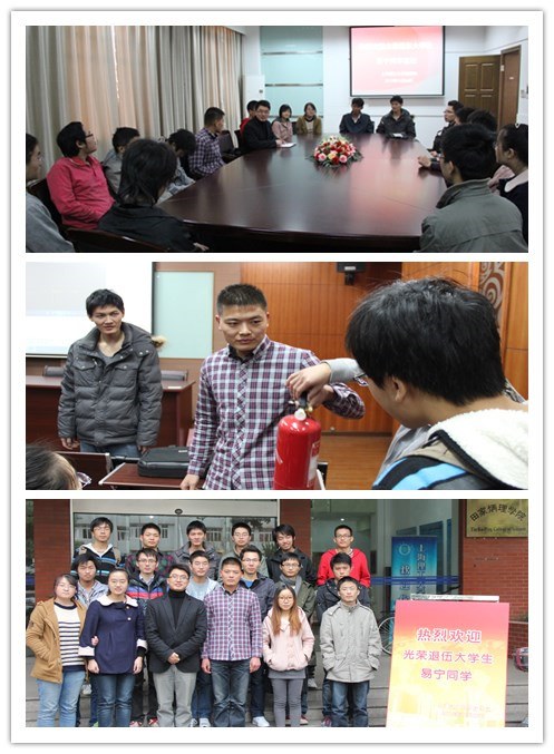 2013年11月26日中午,理学院在二楼会议室隆重举办2013年光荣退伍大学生欢迎式,2010级应用物理学专业易宁同学在安徽淮北武警消防服务两年后光荣返校,理学院分党委副书记李志清、2010级应用物理班全体同学参加欢迎仪式。