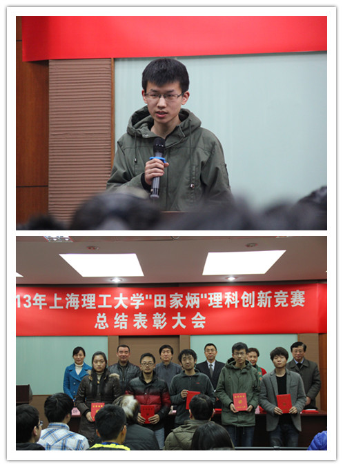教务处处长魏景赋宣读了2013年学校“田家炳”理科创新竞赛获奖学生名单,与会领导共同为获奖学生举行颁奖仪式。校大学生物理竞赛金奖获得者光电信息与计算机工程学院2012级电气信息类专业丁鹏堃同学,大学生数学建模竞赛全国二等奖、上海市一等奖、学校一等奖获奖团队代表机械工程学院2011级车辆工程专业张杏同学分别交流发言。两位同学分别从踏踏实实和坚持不懈的学习态度,从创新在于行动,从创新需要团队协作,需要群策群力的战略、策略等角度分享了宝贵经验。