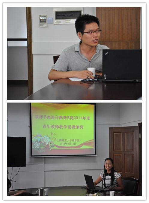 座谈上,首先对获得学院2014年度青年教师教学竞赛奖项的老师进行了颁奖。青年教师教学竞赛是理学院的传统项目,本次竞赛同时也是上半年学院青年教师培训的成果展示。获奖青年教师代表熊非、张晶晶分别发言,他们表示感谢学院提供的平台和机会,感谢带教老师的悉心指导和帮助,作为青年教师要勤奋工作,尤其要做好教学工作,在今后的工作中多与其他老师交流并虚心向有经验的老师请教学习。