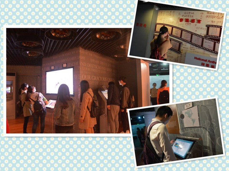 一进入国歌展示馆,映入眼帘的便是一组群雕,象征着影片《风云儿女》主人公辛白华、阿凤及其祖父奔赴前线的事迹。继续向里走入,可以看到一张为《义勇军进行曲》灌制的胶片。来到二层,一行行镂空的字体,将国歌用各个国家的语言,刻在了墙上,大家在环形影院观看了高科技制作的《国歌》纪念片,欣赏到360度顶天立地的全景视频,第一次以如此震撼的方式了解到国歌背后的故事。一面“我和国歌”多媒体展示墙上每个屏幕里都有一个人娓娓动听地讲述“我和国歌”的故事。