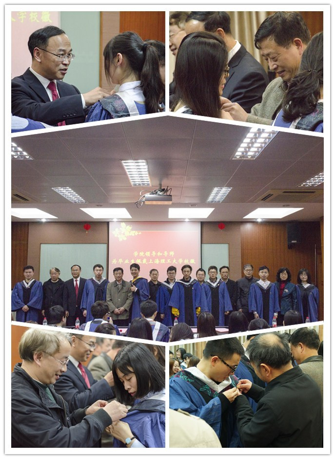 接着,理学院领导和导师代表为所有毕业生郑重地佩戴上海理工大学校徽。老师们细心地将校徽别在毕业生学位服上面,家长般地谆谆教导学生,对学生寄予厚望,希望同学们勿忘母校,常回家看看。